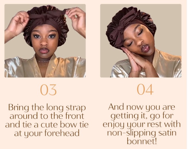 - Bonnet always disappear while opening your eyes? Here come a non-slip Bonnet to solve this headache problem, this satin Bonnets featured with stretchy long band, wide soft, high elastic and skin friendly, you can wrap on head, adjust tightness and then tie to fix Bonnet on head, which can stay on over night, prevent hair from messy, well protect your hair.