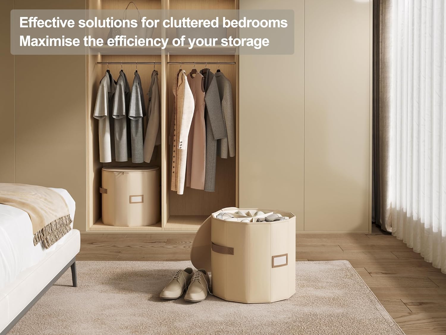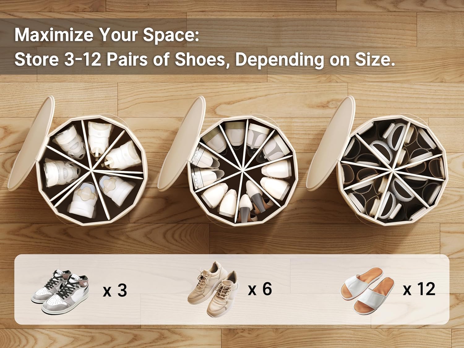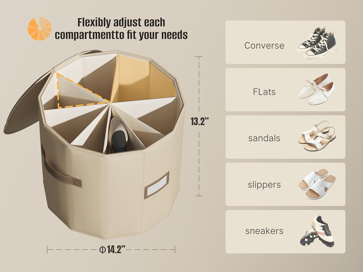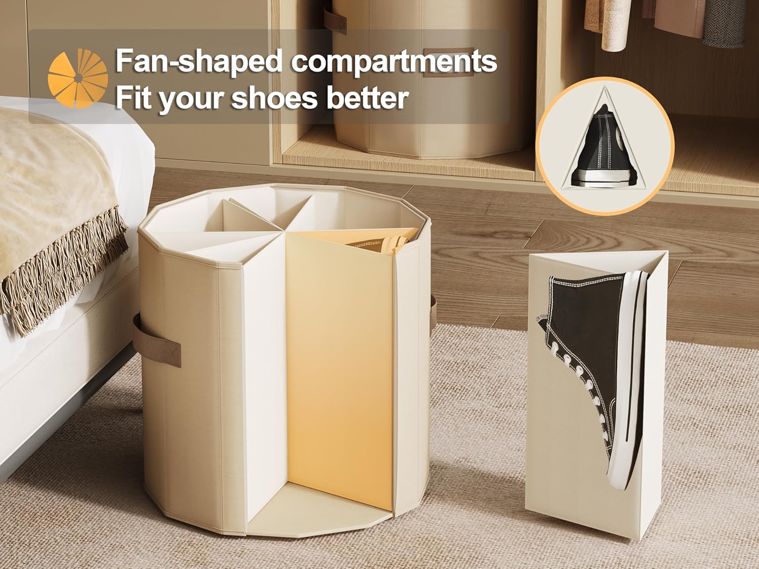 - 【Customizable Compartments】Features 8 adjustable dividers that pivot around a central axis, offering flexible storage solutions that can be tailored to accommodate everything from low-top sneakers to high-top boots. It can accommodate at least 12 pairs of flats, and when the dividers are fully extended to 180 degrees, it can hold at least 3 pairs of knee-high boots.