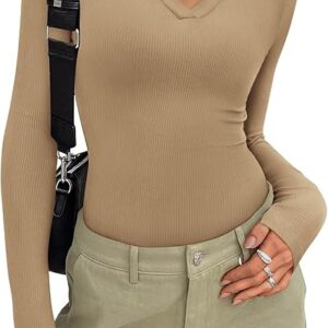 Casual Top Fall Ribbed Knit Collared V Neck Slim Fit Work Blouses.